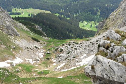 Noch einmal das schöne Kar - etwas größer. Unten die grünen Almgelände von Humlechneralm und Schröckalm.