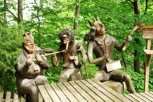 | Nahe am Ausgangspunkt - ein kleines Haus, in dessen Garten und der näheren Umgebung unzählige Holzfiguren (u.a. Karikaturen von Politikern) mit witzigen Sprüchen zum Schmunzeln anregen. |