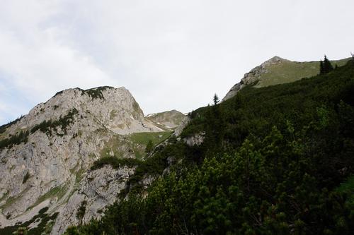 Über einen mal mehr, mal weniger gut sichtbaren Steig über einen Waldrücken in die Latschenzone südlich des Hochhäusl (der grüne Spitz rechts).