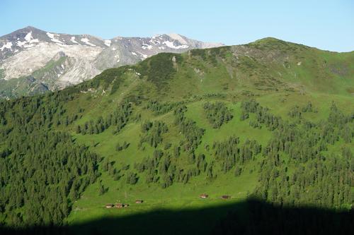 Selbst noch im Schatten gehend, genießt zumindest das Auge die Sonne auf den gegenüberliegenden Almhängen.