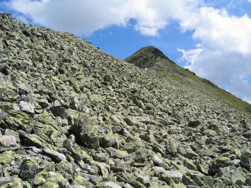Über Steinfelder und anschließend im Fels geht es recht moderat hinauf zum Gipfelkreuz.