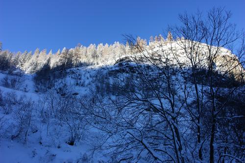 Während wir noch unten im frostigen Schatten wandern (bei der Abfahrt zu Hause hatte es -13,5°C), scheint oben bereits die wärmende Sonne.
