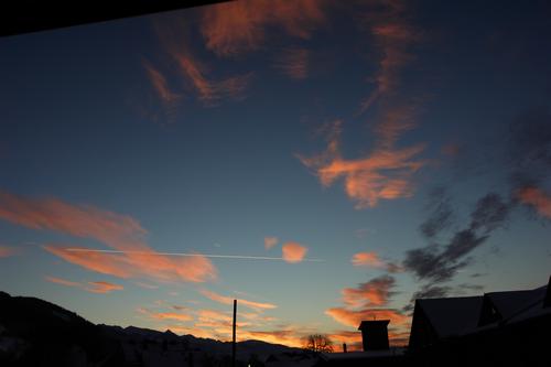 Gemütlicher Ausklang beim "Rüsthäusl" in Öblarn mit Blick durch das große Panoramafenster auf die von der untergehenden Sonne beschienenen Wolken.