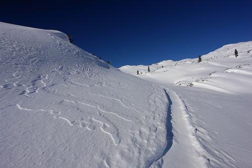 Dennoch ist die Spur teilweise ziemlich verweht. Über der Waldgrenze pfeift ein schneidend-kalter Wind über das Plateau.