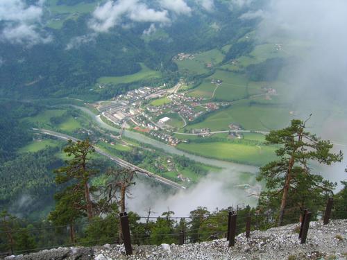 | Unterwegs am bequemen, breiten Weg zwischen Seilbahn-Talstation und Bergstation - Tiefblick ins Tal nach Tenneck. |