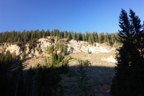 | Von der Leistenalm dreht sich unser Weg nun nordwärts - und an der Seewand über dem kleinen (und für uns heute unsichtbaren) Leistensee vorbei nun westwärts. |