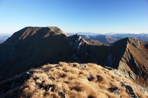 | Mein weiterer Wegverlauf liegt deutlich vor mir: Links der scharfen Kante muß ich irgendwie da oben auf den Grat kommen. Dann geht´s nach links zum Seekarlspitz. Und weiter zum links im Hintergrund liegenden Gr. Knallstein. |