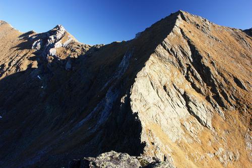 | Die letzten Höhenmeter direkt in die Seekarlscharte sind dagegen steiler und ausgesetzter. Um leichte Kletterei kommt man nicht herum. Noch immer kann ich mir nicht vorstellen, wie ich dan im Bereich der scharfen Felsschneide auf den Grat hinauf gelangen soll. Der Steig verläuft aber recht unspektakulär links der Schneide im Schattenbereich. |