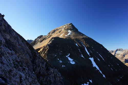 | Der einige Konzentration erfordernde Abstieg in die Seekarlscharte ist geschafft. Blick zurück über die Abstiegsroute. Im oberen Bereich die unschwierigen Wiesenhänge. Darunter der felsige und schmaler werdende Grat. |