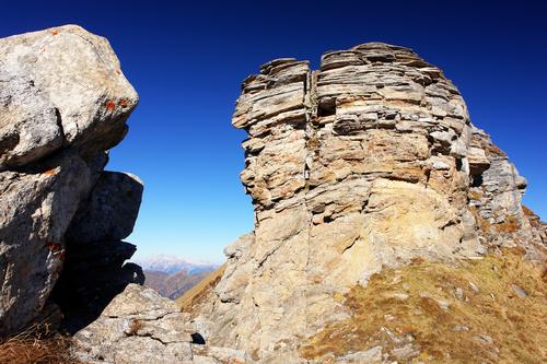 Im Bereich eines Felsturmes wechselt man von der rechten. (=östlichen) auf die linke Gratseite.