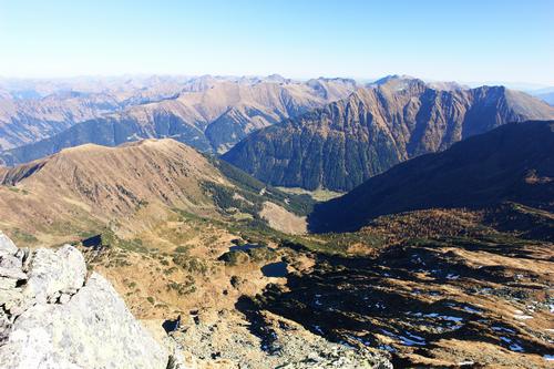| Von ihr hat man einen wunderbaren Ausblick über die Klaftersee´n und die Kaltherberghütte in den Talbereich, wo die heutige Tour über das grüne Almgelände nach rechts führend ihren Ausgang nahm. Darüber das Deneck. |