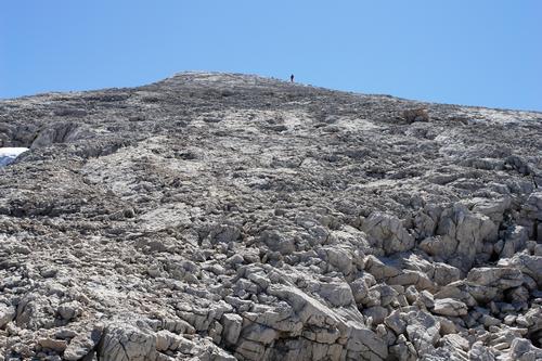 | In der Nähe des Niederen Kreuzes - nach fast 10-stündigem einsamen Aufstieg - treffe ich auf den 1. und - abgesehen von einigen Wanderern im Bereich der Adamekhütte beim späteren Abstieg - auch einzigen Wanderer auf dieser insgesamt 17-stündigen Wanderung. Die Bergfexin ist den Weg vom Hallstätter See heraufgekommen. |