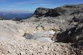 Immer wieder öffnet sich ein neuer gewaltiger Felskessel, den es zu durch- oder umschreiten gilt. Blick zurück zur langgezogenen Wand des Hoßkogels, an deren Füßen sich der Weg nördlich (im Bild rechts) und östlich (von rechts nach links am Wandfuß) entlangzieht. In meterhohen Schließlich erreiche ich den Hohen Trog - jenen Übergang, der nun ostwärts zur Simonyhütte hinunterführt.