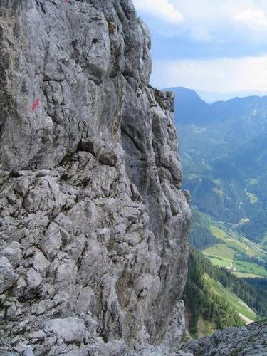 | ... wartet gleich die nächste, anspruchsvollere Schlüsselstelle: Senkrecht und sehr ausgesetzt zieht die Route links der Bildmitte nach oben. |