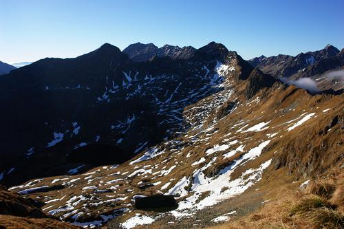 | Aus der Scharte steigt man ca. 100 Höhenmeter wieder ab, um dann dem markierten Weg auf den Scharnock (der Spitz rechts der Bildmitte) zu folgen. |