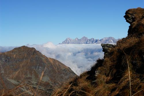 | Nur draußen im Tal lag noch immer eine dichte Nebelsuppe. Ein Felsvorsprung am rechten Bildrand überblickt - einem Gesicht gleich - die Szenerie. |