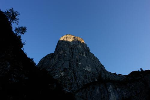 | Von der Zimitzalm folgt man noch kurz einem Forstweg. Bald aber zweigt man auf einem Steiglein über eine kurze, aber unschwierige Steilstufe nordwärts. Der Südausläufer des Siniweler steht wie ein Wächter am Eingang des Salzgrabens, der nun nach links (westwärts) hinaufzieht. |