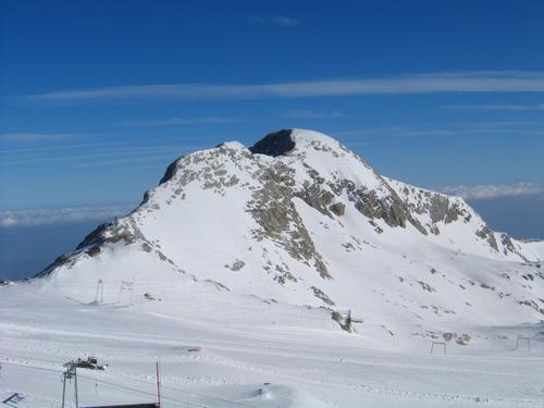 | Raus aus der vollen Gondel in die Gletscherregion am Hunerkogel - Blick zu den Gjaidsteinen, die wir heute umrunden wollen. Abfahrt nach links über den Hallstätter Gletscher und Aufstieg von rechts über die Rumpler-Tour. |