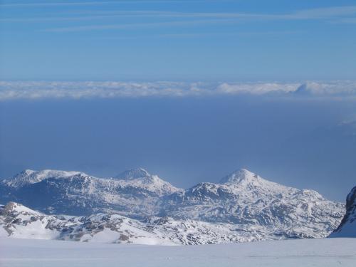 Blick über den Hallstätter Gletscher nach Norden. Nebel und Dunst in Oberösterreich.