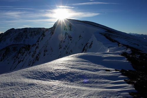 | Nachdem ich die mir selbst auferlegte Umkehrzeit schon bei weitem überschritten hatte (zwischen 16:00 und 08:00 Uhr herrscht am Flick´schen Großgrundbesitz absolutes Betretungsverbot !) und auch der eisige, böige Wind nicht unbedingt motivierend war, sparte ich mir die letzten 60 Höhenmeter auf den Gifpel. |