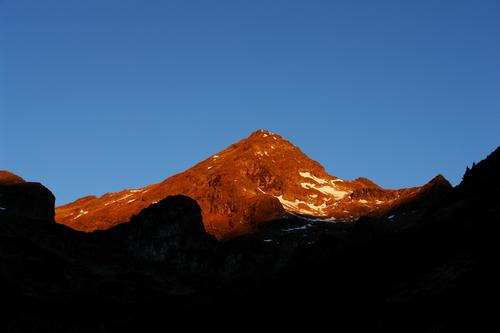 Die aufgehende Sonne taucht die umliegenden Bergspitzen kurz in wunderbare orangerote Farbtöne ...