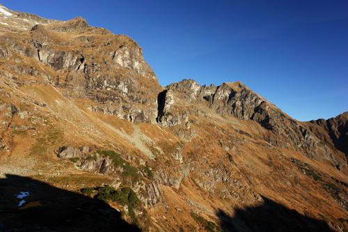 | Heute halten wir uns aber rechts. Über teilweise leicht ausgesetzte Flanken steuern wir nordwärts dem Stierkarkopf (rechts) zu. Eine größere Gamsgruppe mit auffallend vielen kleinen Tieren steigt angesichts der Yeti-Invasion eine Etage tiefer. |