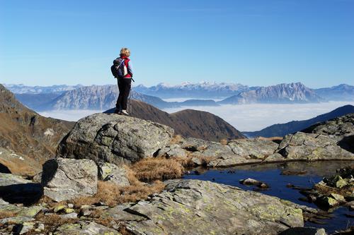 | Nicht ohne zuvor ausgiebig die herrlichen Tiefblicke über das unter einer dicken Nebeldecke liegende Ennstal zu genießen. Kammspitz (links) und Grimming (rechts) ragen heraus. |