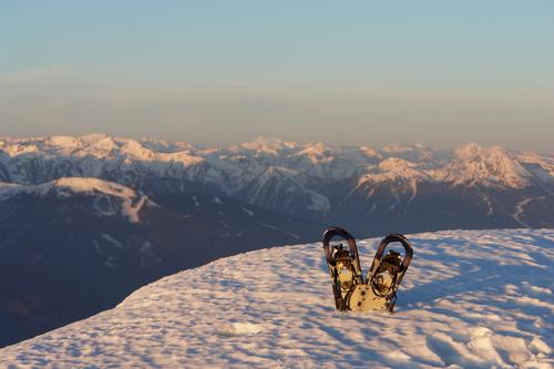 In der Übergangszeit ein gutes Hilfsmittel. Meine Schneeschuhe. Im Hintergrund die Schladminger Tauern.