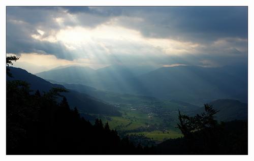 Gröbming im Scheinwerferlicht. Die Sonnenstrahlen dringen durch einige Wolkenlücken und bringen die grünen Wiesen zum Leuchten.