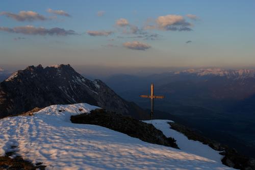 | Die letzten Sonnenstrahlen des ausklingenden Tages erleuchten das Gipfelkreuz am Stoderzinken. Jenes Platzerl mit herrlichem Tiefblick nach Gröbming, an dem wir im kleinen, erlauchten Kreise unsere standesamtliche Hochzeit gefeiert haben. Links im Hintergrund der Kammspitz. |