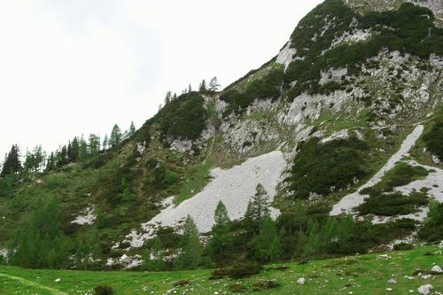 | ... und Aufstieg zum "Werner-Bankerl", von dem der Zustiegssteig in das Steirertor über diese Wiesenflanke oberhalb des Schotterfeldes erfolgt. |