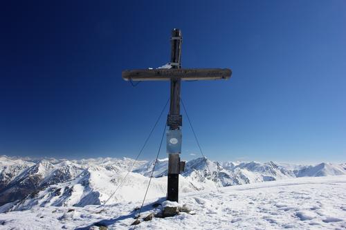 Beim Eiswindumtosten Gipfelkreuz am Talkenschrein.