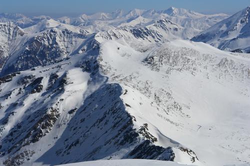 ... und Tiefblick hinunter zur Blaufeldscharte, zu der ich hinunter fahren will.