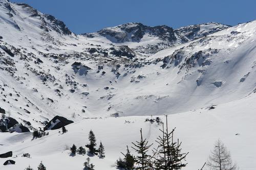 Das gut gestufe Abfahrtsgelände von der Blaufeldscharte zur Schwarzaalm im Überblick.