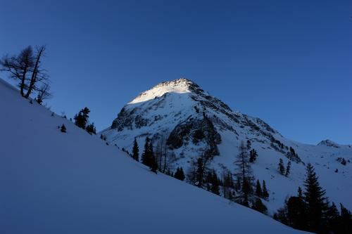 Majestätisch und eindrucksvoll stellt sich der Alker in den Weg. Rechts im Bereich der einzelnen Bäume liegt die Aufstiegsroute.
