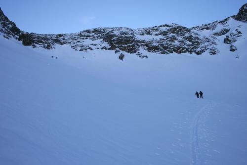 | Die Schlüsselstelle beim Aufstieg (Helmut und Bettina links oben. Patrick und Marie-Luise noch rechts unten). Eine nach oben hin zunehmend aufsteilende und sich verjüngende Rinne ... |