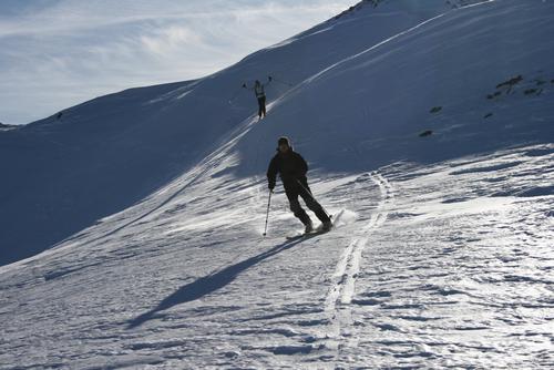 | Auch Patrick und Marie-Luise, die ihre Freude angesichts der tollen Ausblicke und des herrlichen Bergerlebnisses nicht verbergen können, sind auf dem Weg zu einem wingeschützten Jausenplatzerl weiter unten. |