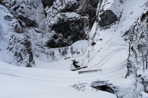 Blick zurück über die Serpentinen, die sich zwischen den Felswänden von Kammspitz und Stoderzinken hindurchschlängeln.