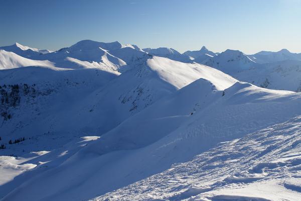 | Ich genieße noch etwas den einsamen Ausblick Richtung Süden. Vom Hohenwart über Eiskarspitz, Schober, Hochwart bis zu Greim und Rettelkirchspitz, den 2 höchsten Gipfeln der Wölzer Tauern (um nur die wichtigsten zu nennen). |