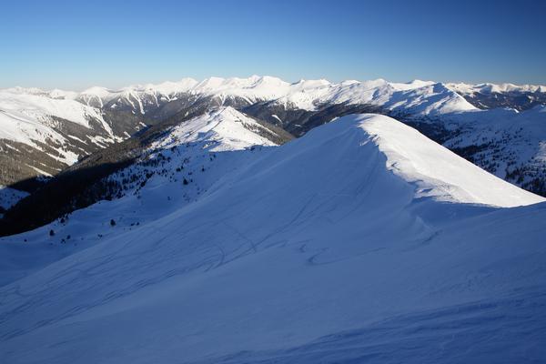 Ein kurzes Stück ostwärts, um an einer geeigneten Stelle über die Wechten in den Nordhang einzusteigen.