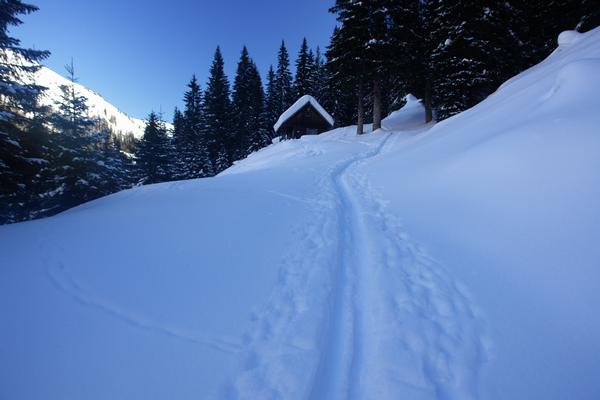 | ... bis zu einer Weggabelung. Während es geradeaus weiter auf den Hintergullingspitz geht, zweigt die Route auf den Brennkogel nach links an der Hütte vorbei ab ... |