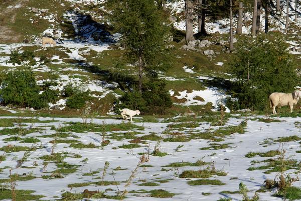 Das kleine Lamm in Bildmitte bekam es mit der Angst zu tun, als wir uns ihm näherten. Und mit aufgeregtem Geblöcke suchte es Schutz unter dem Bauch der Mutter.
