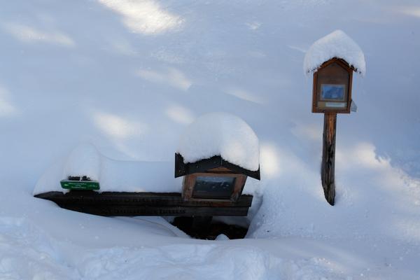 Die unter der Schneelast etwas in Mitleidenschaft gezogenen Wegweiser zur Grabneralm (Wanderweg und Mountainbikeweg) ...