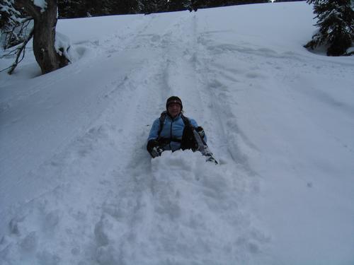 Steilere Hänge lassen sich gut abrutschen. Und wenn man Angst hat hinzufallen, setzt man sich vorsichtshalber gleich in den Schnee.