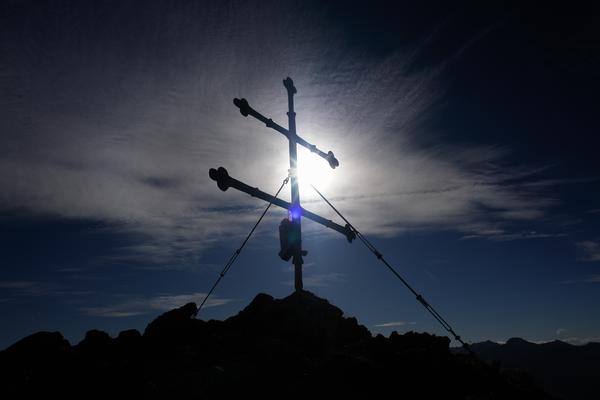 Und bald stehen wir oben am Gipfelkreuz des Kreuzkogel. Die wenigen Wanderer neben uns zogen ob des Sturmes gleich wieder weiter oder stiegen ab.