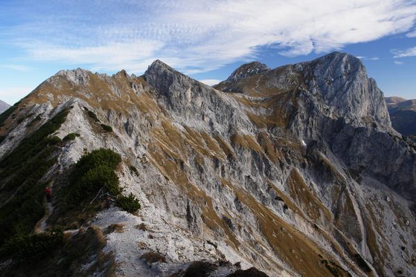 | Wie gesagt, was Größeres war heute gar nicht geplant. Aber ein kurzer Blick und ein knappes Wort zwischen den Bergkameraden genügte, dass wir uns auf den Weiterweg Richtung Osten machten. Wir wollten nun auch noch dem (der?) Riffel (links der Bildmitte) und dem Kalbling (rechts) einen Besuch abstatten. Am Grat entlang (Karl links unten) ... |