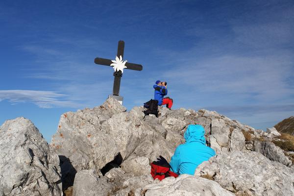 | Schließlich haben wir unseren heutigen 4. Gipfel erreicht - und sämtliche mit Gipfelkreuz ausgestattet. Die raren Wanderer trotzen dickbekleidet dem Wind. |