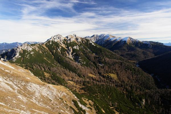 | Die Hochsteinscharte am linken Bildrand liegt deutlich unter mir. Danach - etwa in Bildmitte - mein Gipfelziel. Um auf das Hirscheck zu gelangen, werde ich aus der Scharte den ganzen Grat (über die Alblplan) abschreiten. Im Hintergrund die "Mölbinge". |