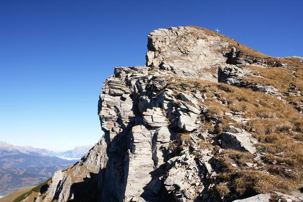 ... und nach vor auf die Spitze der Höllwand. Ingrid steht bereits knapp unterhalb des Gipfelkreuzes.