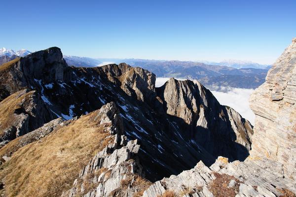 Durch eine dieser Nischen werden wir etwas später auf die schattige Seite hinab wechseln und an den Westhängen von Höllwand und Sandkogel zum Heukareck hinüber queren.